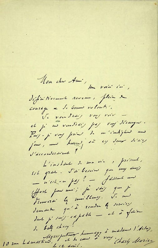 Charles Morice (1860-1919), poète, écrivain. L.A.S., 12 août, 1p in-8. À l'écrivain Armand d'Artois (1847-1912). « Mon cher ami, Me voici ici définitivement revenu, plein de courage & de bonne volonté. Je voudrais vous voir - et je ne voudrais pas vous déranger. Puis-je vous prier de m'indiquer un jour, une heure, où ces deux désirs s'accorderaient ? L'instant de ma vie, présent, est grave. J'ai besoin que mes amis - n'est-ce pas ? - fassent un effort pour moi ; je sais que je trouverai les meilleurs. Je ne demande qu'à rendre les services dont je suis capable - et à faire de belles choses ! Mes respectueux hommages à madame d'Artois et de coeur à vous. Charles Morice ». [467]