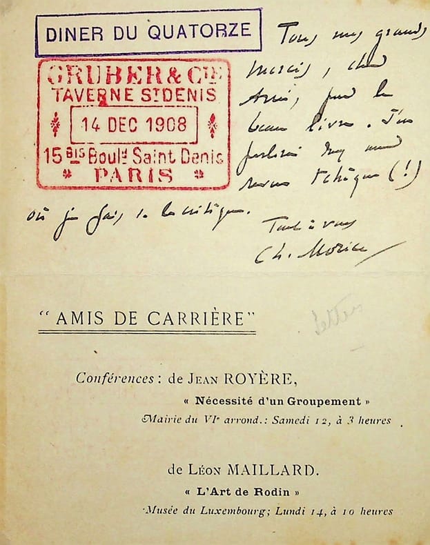 Charles Morice (1860-1919), poète, écrivain. L.A.S., 10 décembre 1908, 1p in-12. A l'écrivain Jules de Marthold (1847-1927). Courte lettre pour indiquer le « dîner du quatorze », le 14 février 1907. Cachets et « tous mes grands mercis, cher Ami, pour le beau livre. J'en parlerai dans ma revue tchèque (!) où je fais de la critique. Tout à vous. Ch. Morice ». Ce dîner mensuel fut créé en octobre 1906. [467]