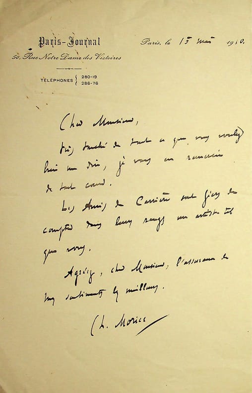 Charles Morice (1860-1919), poète, écrivain. L.A.S., 15 mai 1910, 1p in-8. « Cher Monsieur, Très touché de tout ce que vous voulez bien me dire, je vous en remercie de tout coeur. Les Amis de Carrière sont fiers de compter dans leurs rangs un artiste tel que vous. Agréez, cher Monsieur, l'assurance de mes sentiments les meilleurs. Ch. Morice ». Il s'agit des amis du peintre Eugène Carrière (1849-1906). [467]