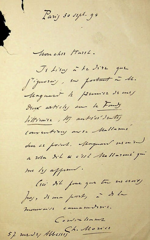 Charles Morice (1860-1919), poète, écrivain. L.A.S., Paris, 30 septembre 1894, 1p in-8. A l'écrivain Jules Huret (1863-1915). « Mon cher Huret, Je tiens à te dire que j'ignorais, en portant à M. Magnard le premier de mes deux articles sur le Fonds littéraire, tes antécédentes conventions avec Mallarmé sur ce point. Magnard ne m'en a rien dit & c'est Mallarmé qui me les apprend. Ceci dit pour que tu ne crois pas, de ma part, à de la mauvaise camaraderie. Cordialement Charles Morice ». Petit manque marginal. [467]