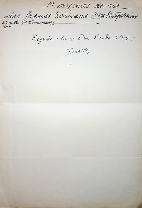 Alexandre-Marie Desrousseaux dit Bracke (1861-1955), écrivain, helléniste, homme politique, militant socialiste, premier traducteur français de Rosa Luxemburg. Manuscrit A.S., 26 juillet 1936, 1/4p in-folio. Réponse de Bracke à une grande enquête : Maximes de vie des grands écrivains contemporains. « Regarde : tu es l'un d'entre eux. Bracke ». Cette enquête était faite par l'écrivain Henri Corbière (1888-1980). [468]