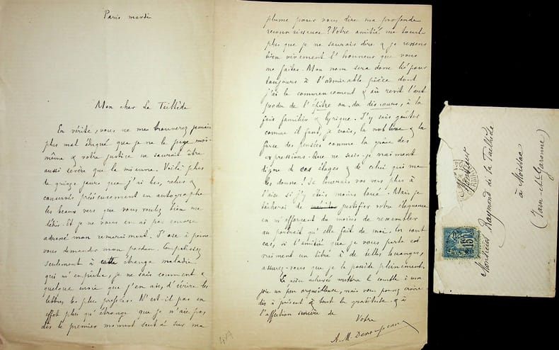 Ernest Raynaud (1864-1936), poète, écrivain. L.A.S., sd [après 1925], 1p in-8. « Mon cher ami, Le dernier poème que je vous ai adressé avait un grave défaut : celui de ne pas être d'une contexture uniforme ni d'un grain assez serré d'un bout à l'autre. J'ai cru bien faire en le divisant de la façon dont vous pourrez vous rendre compte en jetant les yeux sur le manuscrit ci-joint, corrigé. D'un poème, j'en fais deux. Les deux pièces d'un ton différent retrouvent ainsi l'unité de style qui leur manquait. Croyez à mes affectueux sentiments. Ernest Raynaud ». On joint une enveloppe autographe du 21 novembre 1912 adressée à Raymond de La Tailhède, qui était jointe à ce document. Peut-être que la lettre est aussi adressée à La Tailhède. [465]