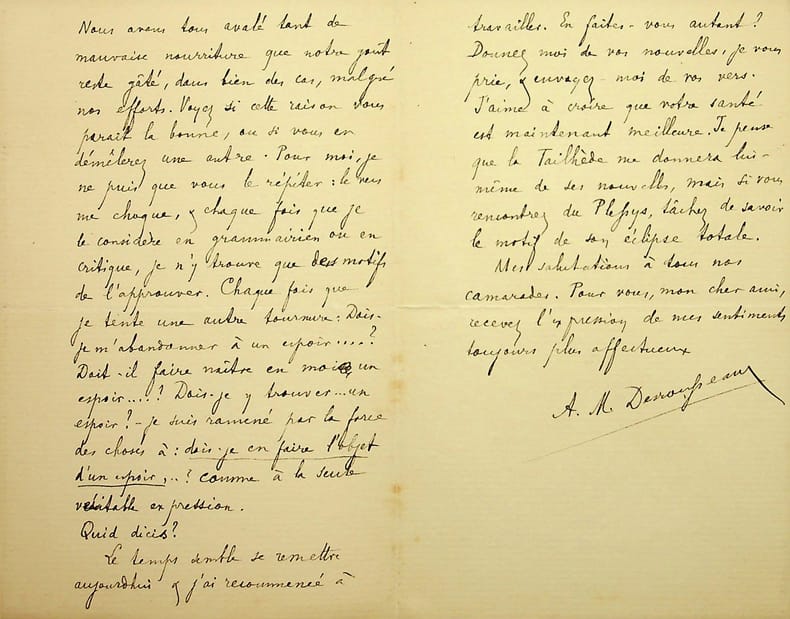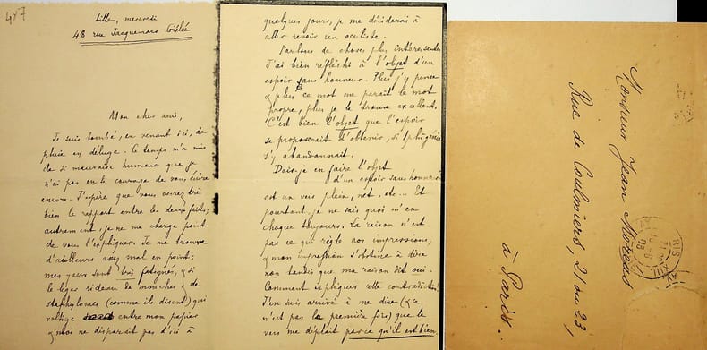 Alexandre-Marie Desrousseaux dit Bracke (1861-1955), écrivain, helléniste, homme politique, militant socialiste, premier traducteur français de Rosa Luxemburg. L.A.S., Lille, sd [mercredi], 4p in-8. Au poète Jean Moréas (1856-1910).Longue et belle lettre alors qu'il subit pluie et déluge à Lille. Il disserte ensuite longuement sur un vers : « Dois-je en faire l'objet d'un espoir sans honneur ». Son impression est mauvaise mais la raison lui dit que ce vers est bon. « Nous avons tous avalé tant de mauvaise nourriture que notre goût reste gâté, dans bien des cas, malgré nos efforts. [.] Pour moi, je ne puis que vous le répéter : le vers me choque, & chaque fois que je le considère en grammairien ou en critique, je n'y trouve que des motifs de l'approuver. Chaque fois que je tente une autre tournure [.] je suis ramené par la force des choses à : dois-je en faire l'objet d'un espoir. ? Comme la seule véritable expression ». [468]
