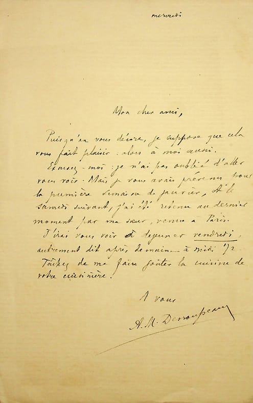 Alexandre-Marie Desrousseaux dit Bracke (1861-1955), écrivain, helléniste, homme politique, militant socialiste, premier traducteur français de Rosa Luxemburg. L.A.S., sd [mercredi], 1p in-8. Peut-être au poète Jean Moréas (1856-1910). « Mon cher ami, Puisqu'on vous décore, je suppose que cela vous fait plaisir : alors à moi aussi. Excusez-moi : je n'ai pas oublié d'aller vous voir. Mais je vous avais prévenu pour la première semaine de janvier, et le samedi suivant, j'ai été retenu au dernier moment par ma soeur, venue à Paris. J'irai vous voir à déjeuner vendredi, autrement dit après demain à midi 1/2. Tâchez de me faire goûter la cuisine de votre cuisinière. A vous A.M. Desrousseaux ». [468]