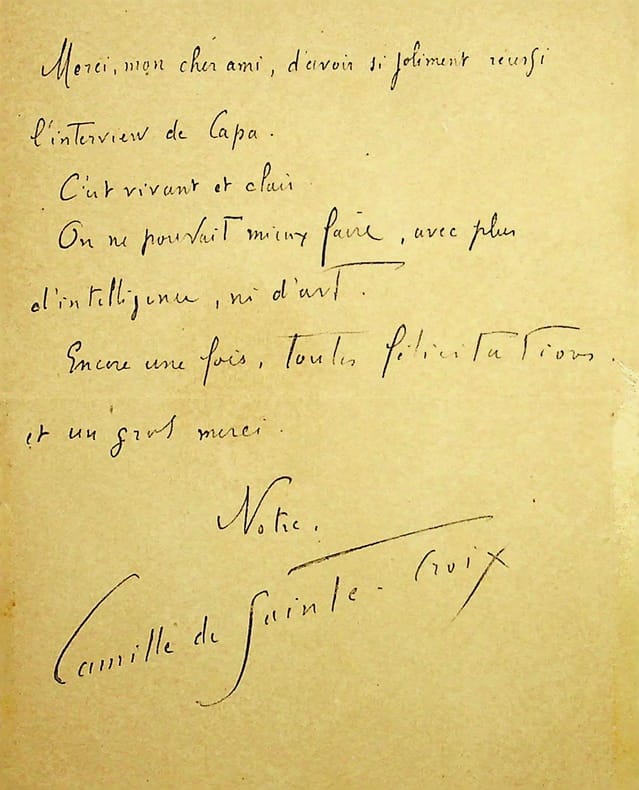 Camille de Sainte-Croix (1859-1915), écrivain, journaliste. L.A.S., 4 août 1891, 1p in-12. A l'écrivain Jules Huret (1863-1915). « Merci, mon cher ami, d'avoir si joliment réussi l'interview de Capa. C'est vivant et clair. On ne pouvait mieux faire, avec plus d'intelligence, ni d'art. Encore une fois, toutes félicitations et un gros merci. Votre Camille de Sainte-Croix ». Probablement suite à une interview dans l'Echo de Paris. [468]