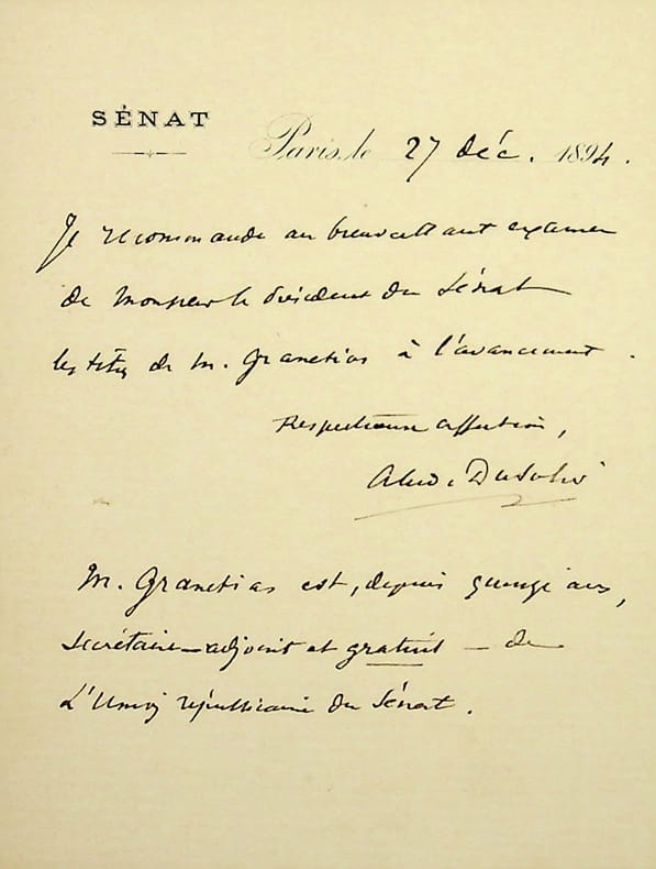 Alcide Dusolier (1836-1918), écrivain, homme politique, député et sénateur de Dordogne, secrétaire de Léon Gambetta en 1870. L.A.S., Paris, 27 décembre 1894, 1p in-12. A Paul Challemel-Lacour (1827-1896), président du Sénat. Il lui recommande à l'avancement M. Granetias, un secrétaire-adjoint de l'Union républicaine du sénat. [468]