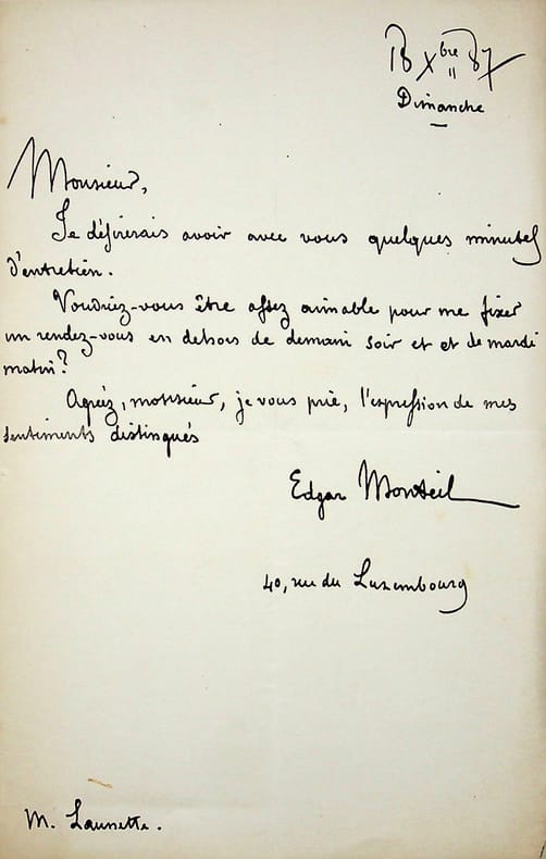 Edgar Monteil (1845-1921), écrivain, homme politique, communard, franc-maçon. L.A.S., 18 décembre 1887, 1p in-8. A l'éditeur Henri Launette (1845-1894) : « Monsieur, Je désirerais avoir avec vous quelques minutes d'entretien. Voudriez-vous être assez aimable pour me fixer un rendez-vous en dehors de demain soir et de mardi matin ? Agréez, monsieur, je vous prie, l'expression de mes sentiments distingués. Edgar Monteil ». Peu commun. [469]