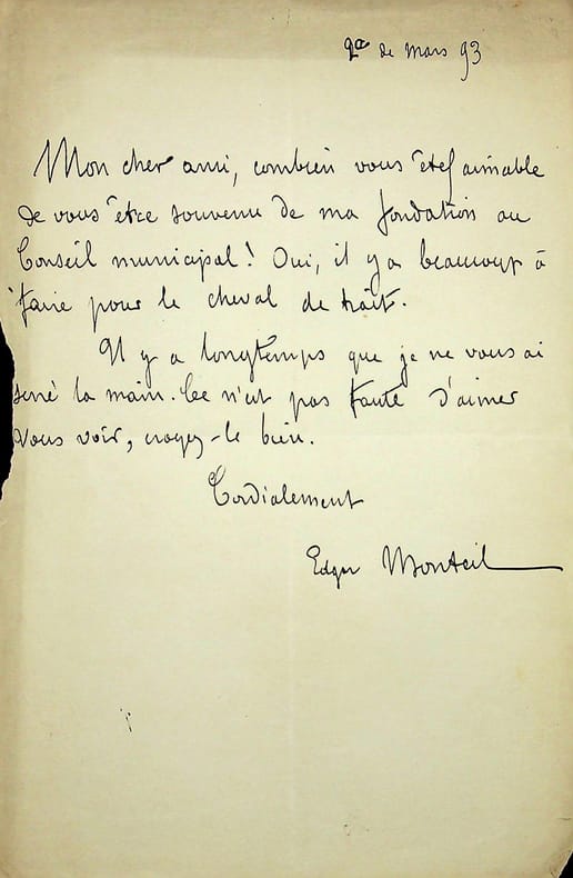 Edgar Monteil (1845-1921), écrivain, homme politique, communard, franc-maçon. L.A.S., 2 mars 1893, 1p in-8. « Mon cher Ami, combien vous êtes aimable de vous être souvenu de ma fondation au Conseil municipal ! Oui, il y a beaucoup à faire pour le cheval de trait. Il y a longtemps que je ne vous ai serré la main. Ce n'est pas faute d'aimer vous voir, croyez-le bien. Cordialement. Edgar Monteil ». Peu commun. [469]
