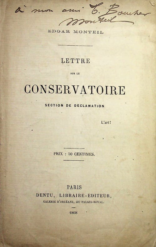 Edgar Monteil, Lettre sur le Conservatoire - section de déclamation. Paris, Dentu, 1868. In-8, 16p. Très rare plaquette avec un envoi sur le titre : « à mon ami C Boucher. Monteil ». Rare. [469]
