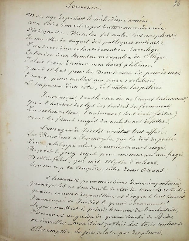 Louis Belmontet (1798-1879), poète, homme politique, député du Tarn-et-Garonne. Poème autographe signé, sd [après 1853], 2p in-4. Long poème de 56 vers proche d'une partie de son ouvrage Les Impérialistes ou une page d'histoire (Paris, Bennuyer, 1853). Il en reprend certains vers (à partir de la p.6), avec des variantes et de nouveaux vers. Feuillet provenant probablement d'un album et signé « L Belmontet député-poète ». Très beau document en grande partie inédit. [469]