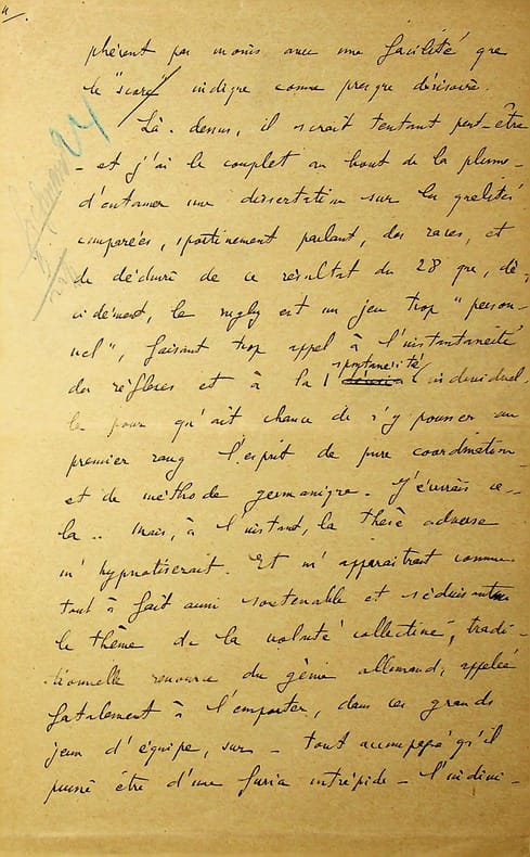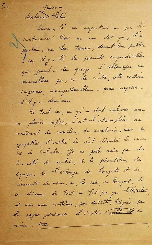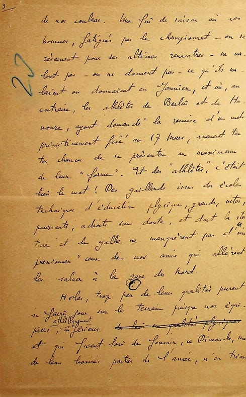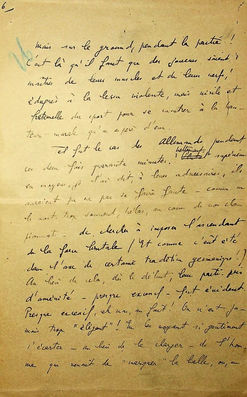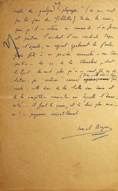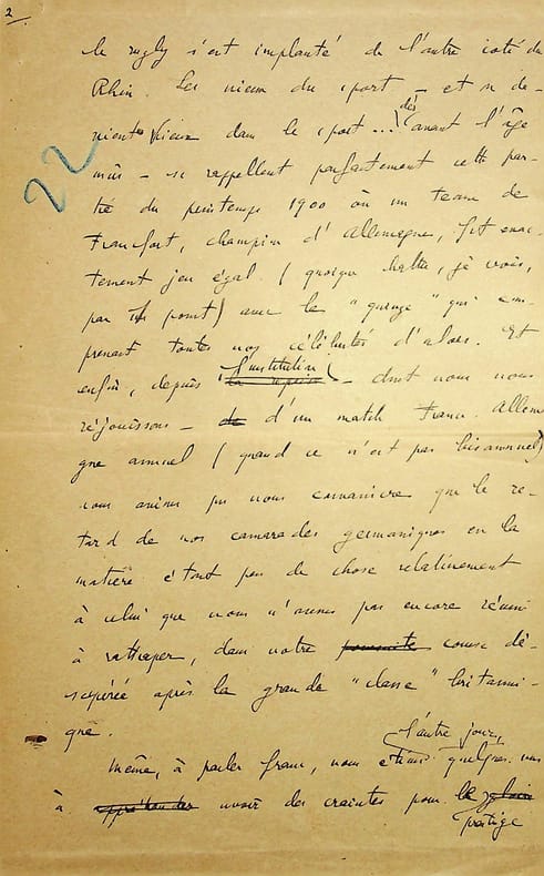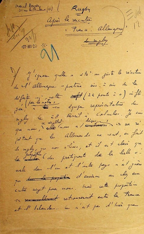 Marcel Berger (1885-1966), écrivain, journaliste, journaliste sportif notamment pendant les Jeux Olympiques d'été 1920. Manuscrit A.S., 7 mai 1929, 7p in-8. Manuscrit d'un article « Rugby - Après la rencontre France-Allemagne » suite à la rencontre du 28 avril à Colombes lors de laquelle la France à battu l'Allemagne 24 à 0. Il s'agit seulement de la 4e confrontation officielle entre les deux pays. Bel article, rare. [469]
