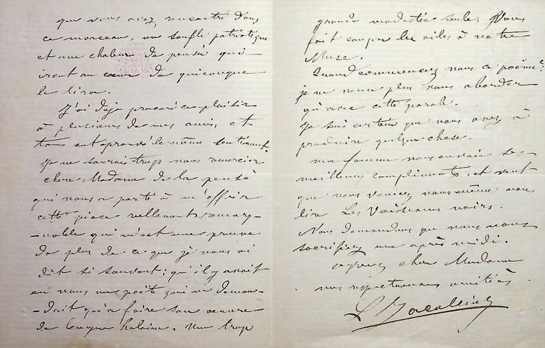 Louis Jacolliot (1837-1890), écrivain, indianiste, premier à parler d'Asgartha. L.A.S., sd, 3p in-12. Belle lettre à une poétesse pour la remercie des vers qu'elle lui a dédiés. Il les a fait lire à plusieurs amis et tous les ont appréciés. Il lui demande de venir lire le poème, titré « Les Vaisseaux noirs ». Rare autographe. [470]