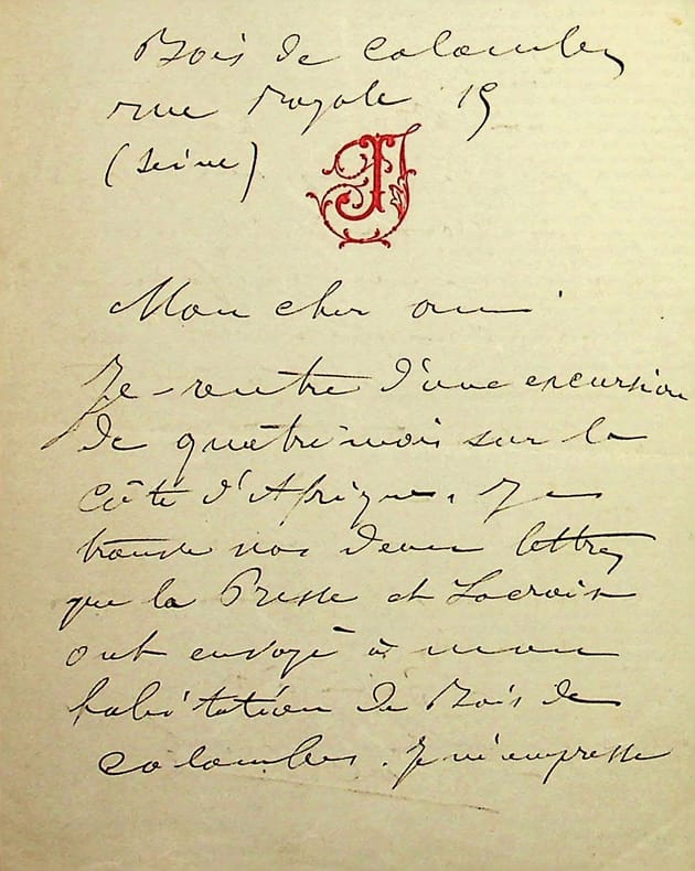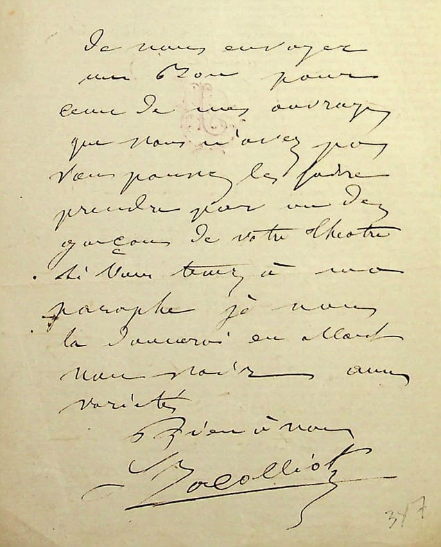 Louis Jacolliot (1837-1890), écrivain, indianiste, premier à parler d'Asgartha. L.A.S., sd, 2p in-12. « Mon cher ami, je rentre d'une excursion de quatre mois sur la côte d'Afrique. Je trouve vos deux lettres que la Presse et Lacroix ont envoyé à mon habitation de Bois de Colombes. Je m'empresse de vous envoyer un bon pour ceux de mes ouvrages que vous n'avez pas. Vous pourrez les faire prendre par un des garçons de votre théâtre. Si vous voulez ma paraphe, je vous la donnerai en allant vous voir aux Variétés. Bien à vous. L Jacolliot ». Rare autographe. [470]