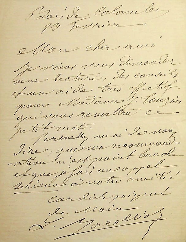 Louis Jacolliot (1837-1890), écrivain, indianiste, premier à parler d'Asgartha. L.A.S., 13 février, 1p in-12. Il recommande madame J Touzin à son correspondant. [470]