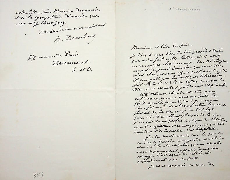 Maurice Beaubourg (1859-1943), écrivain, journaliste. L.A.S., sd [1924], 1p 1/2 in-8. A l'écrivain Henri Duvernois (1875-1937). Belle lettre de remerciements pour les éloges de Duvernois sur son roman Madame Chicot. [470]