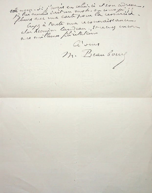 Maurice Beaubourg (1859-1943), écrivain, journaliste. L.A.S., 3 février 1927, 2p 1/2 in-8. A l'écrivain et journaliste Maurice Landeau. Il le remercie pour sa conférence sur lui et son oeuvre. Il le félicite aussi pour sa lecture de ses oeuvres, faite « à la perfection ». Belle lettre. [470]