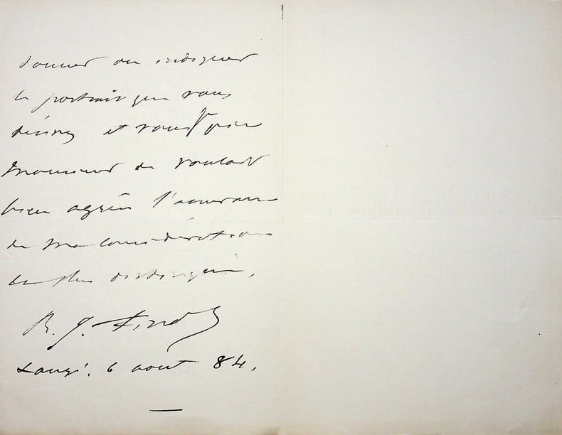 Jean Finot (1856-1922), sociologue, écrivain, journaliste. L.A.S, 5 avril 1884, 2p in-8. Etant absent de Paris, il n'a pas pu lire l'article de son correspondant à son sujet, article qu'il sait « bienveillant, trop bienveillant ». Il le lira à son retour. [470]