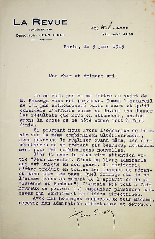 Jean Finot (1856-1922), sociologue, écrivain, journaliste. L.S, Paris, 3 juin 1915, 1p in-8. Entête de La Revue. A l'écrivain Edouard Petit (1858-1917). A propos d'un courrier sur M. Passega et sur l'ouvrage de Petit, Jean Lavenir, que Finot encense. [470]