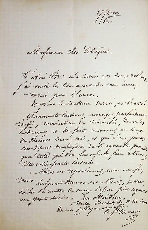 Hector de Saint Maur (1808-1879), poète, ami de Jules Barbey d'Aurevilly. L.A.S., 17 mars 1862, 1p in-8. A l'écrivain Edouard Fournier (1819-1880). Jolie lettre de remerciements pour deux livres de Fournier apportés par Alphonse Brot. Il termine : « Le Grand Dumas est à Paris, je vais tâcher de mettre la main dessus pour organiser une petite soirée ». [471]