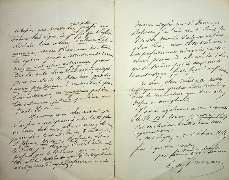 Hector de Saint Maur (1808-1879), poète, ami de Jules Barbey d'Aurevilly. L.A.S., sd [1865], 3p in-8. A l'écrivain Edouard Fournier (1819-1880). Longue lettre sur sa traduction des psaumes, basés sur les éditions de Saint Jérôme, de la Vulgate et de Bossuet, en latin, « cette belle langue latine que nous oublions un peu plus chaque jour ». Cette édition a été publiée en 1865. Belle lettre sur son travail de poète. [471]