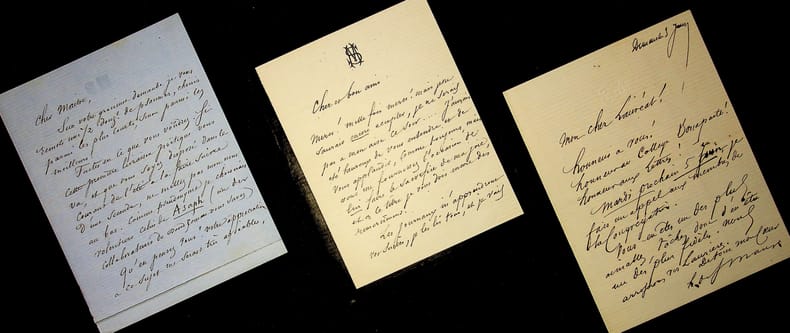 Paul Margueritte (1860-1918), écrivain. Lot de 9 L.A.S donc 4 avec enveloppe, 1896-1897, 14p. Très intéressant ensemble autour de son divorce. 6 lettres sont adressées à René Pilastre, « avoué de première instance », 1 lettre à Henry Simond. Les deux dernières lettres sont probablement aussi à Pilastre. [343]
