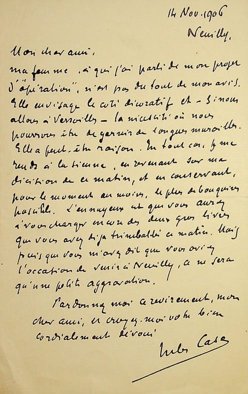 Jules Case (1854-1931), écrivain, journaliste. L.A.S., Neuilly, 14 novembre 1906, 1p in-8. « Mon cher ami, Ma femme, à qui j'ai parlé de mon projet d'"opération", n'est pas du tout de mon avis. Elle envisage le côte décoratif et, si nous allons à Versailles, la nécessité où nous pourrons être de garnir de longues murailles. Elle a peut-être raison. En tout cas, je me rends à la sienne, en revenant sur ma décision de ce matin, et en conservant, pour le moment au moins, le plus de bouquins possibles. L'ennuyeux est que vous aurez à vous charger encore des deux gros livres que vous avez déjà trimballés ce matin. Mais puisque vous m'avez dit que vous aviez l'occasion de venir à Neuilly, ce ne sera qu'une petite aggravation. Pardonnez-moi ce revirement, mon cher ami, et croyez-moi votre bien cordialement dévoué. Jules Case ». [471]