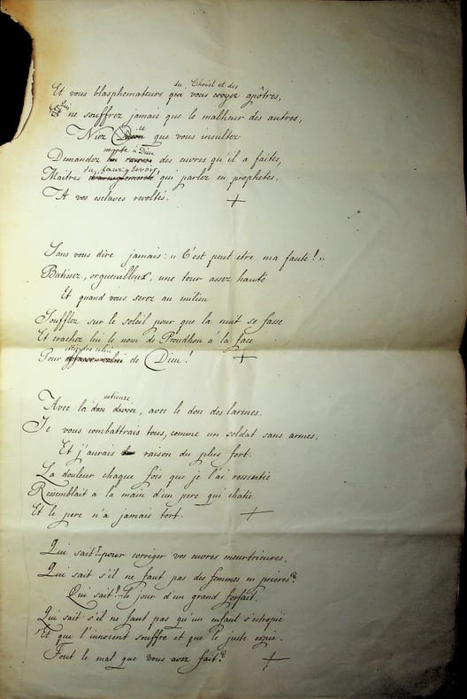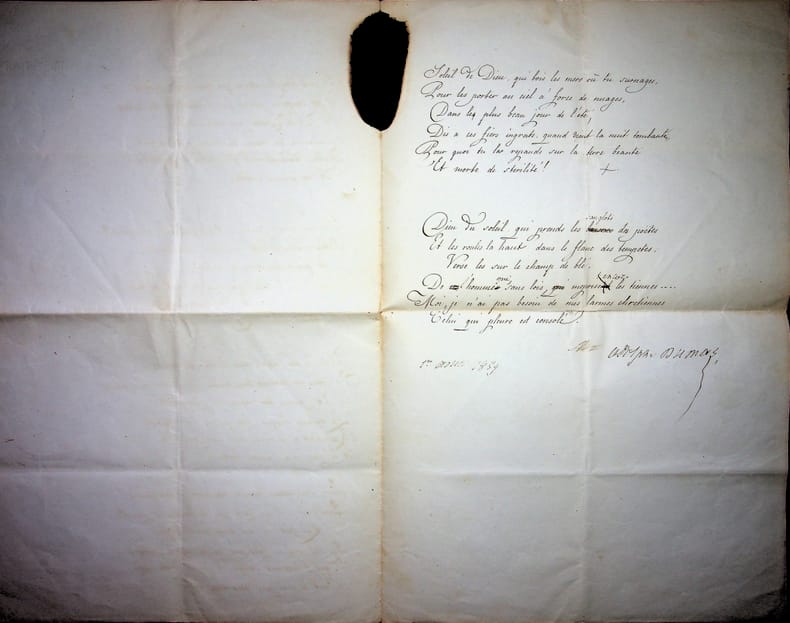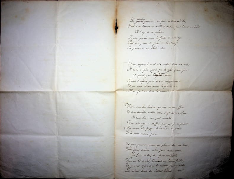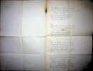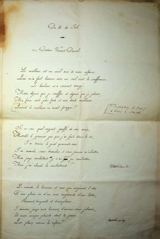 Adolphe Dumas (1805-1861), poète, écrivain. Poème signé, 1er août 1859, 4p in-folio. Long et beau poème, titré « Du lit de Job » et dédié au docteur Vincent Duval, qui avait une clinique à Chaillot et soignait alors Dumas qui s'était « broyé le pied ». Le poème est divisé en 14 sizains, écrits par un secrétaire, avec quelques corrections d'Adolphe Dumas qui signe et date le poème. Bien qu'une note de Dumas laisse supposer une publication, nous n'avons pas pu en trouver trace. Document brulé en marge. Beau document. [471]