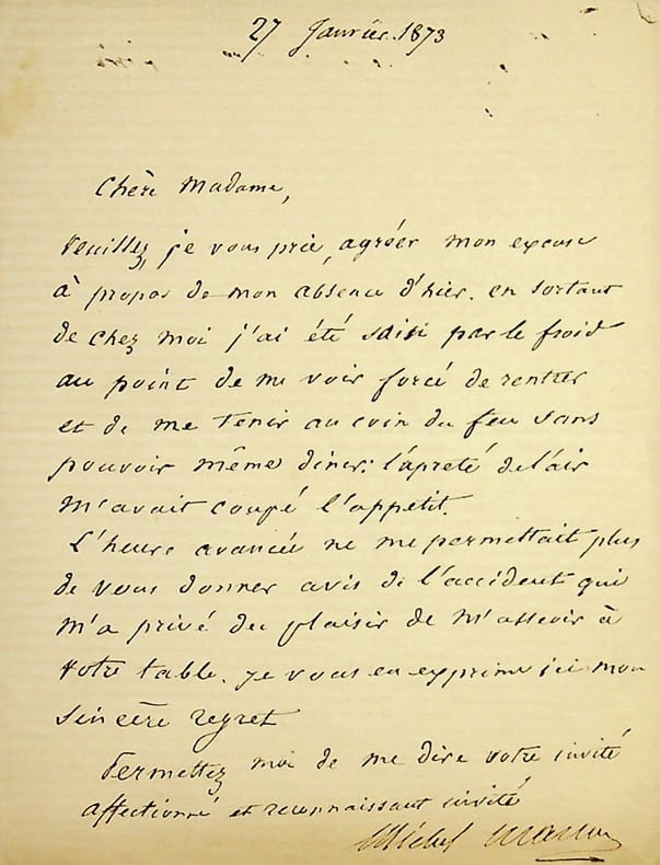 Michel Masson (1800-1883), écrivain, journaliste. L.A.S., 27 janvier 1873, 1p in-12. Excuses pour une absence la veille à cause du froid. [471]