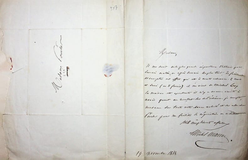 Michel Masson (1800-1883), écrivain, journaliste. L.A.S., 19 novembre 1848, 1p in-8. A madame Porcher, de l'agence Porcher-Prudhommeaux qui finançaient les auteurs. Il demande de l'aide pour le paiement d'un billet, précisant qu'il sera payé par l'éditeur Michel Lévy le 5 février. « la maison est excellent et il n'y a aucune crainte à avoir quant au résultat lors de l'échéance ». [471]