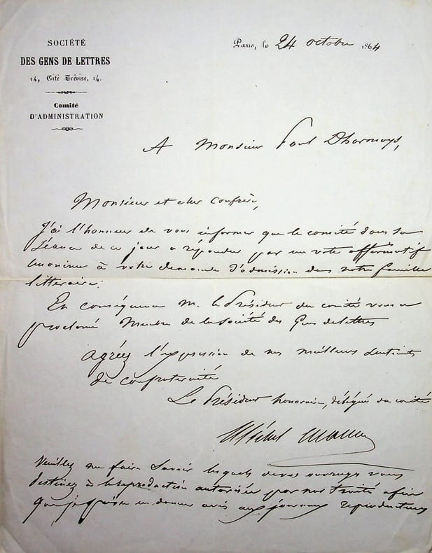 Michel Masson (1800-1883), écrivain, journaliste. L.A.S., Paris, 24 octobre 1864, 1p in-4. Entête de la Société des Gens de Lettres dont il est membre du comité et président honoraire. A l'écrivain Paul Dhormoys (1828-1889). Il lui annonce sa réception à la Société des Gens de lettre dans la séance du jour. [471]