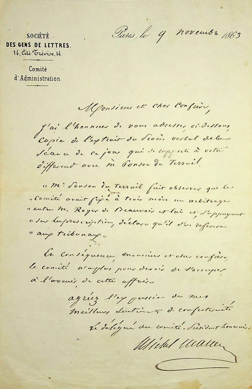 Michel Masson (1800-1883), écrivain, journaliste. L.A.S., Paris, 9 novembre 1863, 1p in-8. Entête de la Société des Gens de Lettres dont il est membre du comité et président honoraire. A l'écrivain Roger de Beauvoir (1807-1866). « Monsieur et cher confrère, J'ai l'honneur de vous adresser, ci-dessous, copie de l'extrait du procès-verbal de la séance de ce jour qui se rapporte à votre différend avec M. Ponson du Terrail. "M Ponson du Terrail fait observer que le comité avait fixé à trois mois un arbitrage entre M. Roger de Beauvoir et lui et, s'appuyant sur la prescription, déclare qu'il s'en référera aux tribunaux". En conséquence, Monsieur et cher confrère, le comité n'a plus pour devoir de s'occuper à l'avenir de cette affaire. Agréez l'expression de mes meilleurs sentiments de confraternité. Le délégué du comité-président honoraire Michel Masson ». [472]