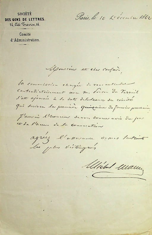 Michel Masson (1800-1883), écrivain, journaliste. L.A.S., Paris, 10 décembre 1862, 1p in-8. Entête de la Société des Gens de Lettres dont il est membre du comité et président honoraire. A l'écrivain Roger de Beauvoir (1807-1866). « Monsieur et cher confrère, La commission chargée de vous entendre contradictoirement avec M. Ponson du Terrail s'est ajournée à la date de la séance du comité qui suivra la première quinzaine de janvier prochain. J'aurai l'honneur de vous donner avis du jour et de l'heure de la convocation. Agréez l'assurance de mes sentiments les plus distingués. Michel Masson ». [472]
