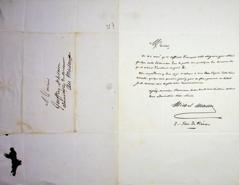Michel Masson (1800-1883), écrivain, journaliste. L.A.S., sd, 1p in-8. Au zoologiste Isidore Geoffroy Saint-Hilaire (1805-1861). « Monsieur, On m'a assuré qu'il suffisait d'invoquer votre obligeance pour obtenir quelques cartes d'admission dans les parties non publiques du muséum telles que le cabinet d'anatomie comparée &c. Vous me pardonnerez donc si je m'adresse à vous avec l'espoir d'être bien accueilli. Quelque vois que vous preniez pour me faire parvenir ces billets, je les recevrai avec la plus vive reconnaissance. Agréez, monsieur, l'assurance de ma haute considération et de mon admiration bien sincère. Michel Masson ». [472]