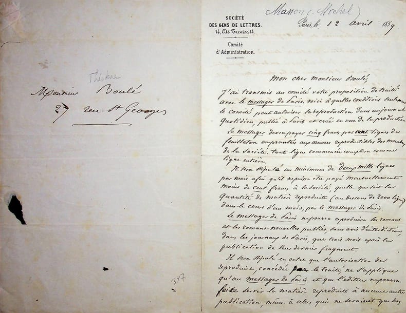 Michel Masson (1800-1883), écrivain, journaliste. L.A.S., Paris, 12 avril 1859, 1p 1/2 in-8. Entête de la Société des Gens de Lettres dont il est membre du comité et président honoraire. Au commissaire priseur, imprimeur et directeur de journaux Théodore Boulé (1799-1877). A propos du projet de traité entre la Société et le journal Le Message de Paris. Il donne les conditions. Intéressante lettre. [472]