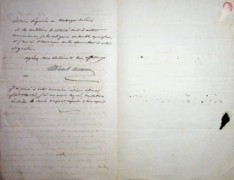 Michel Masson (1800-1883), écrivain, journaliste. L.A.S., 6 novembre 1844, 1p 1/2 in-8. Au commissaire priseur, imprimeur et directeur de journaux Théodore Boulé (1799-1877) (même provenance que d'autres lettres à Boulé, sujet très proche d'une autre lettre de 1844). A propos d'un roman de Frédéric Thomas et Masson qui est accepté par Félix Solar (1811-1870) et Jean-Baptiste Rosemond de Beauvallon (1819-1903). Boulé ayant déjà payé le manuscrit, c'est donc lui qui sera payé par Le Globe et il pourra garder l'excédent. Il s'agit probablement de la publication en feuilleton de La jeune Régente, qui sera recueilli en volume en 1845. Intéressante lettre. [472]