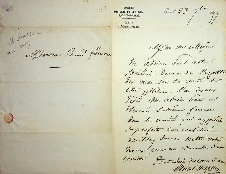 Michel Masson (1800-1883), écrivain, journaliste. L.A.S., Paris, 23 septembre 1859, 1p in-8. Entête de la Société des Gens de Lettres dont il est membre du comité et président honoraire. A l'écrivain Edouard Fournier (1819-1880). Il demande à Fournier son apostille sur une pétition d'Adrien Paul. On sait peut de choses sur Adrien Paul, un romancier du XIXe siècle. [472]