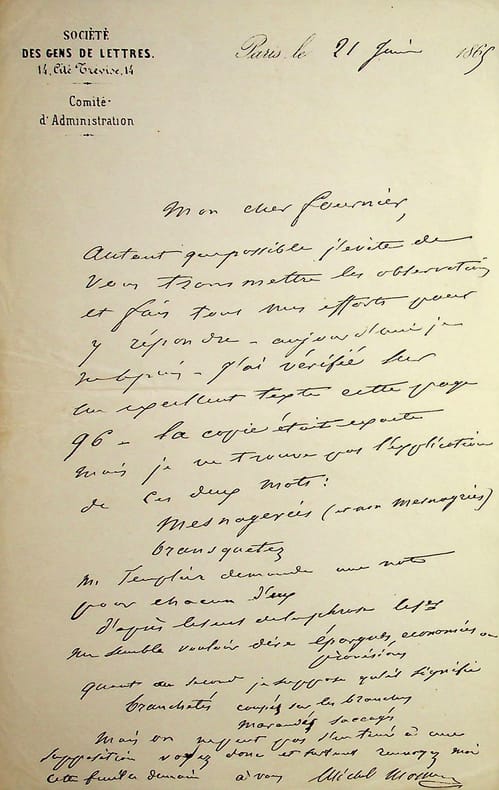 Michel Masson (1800-1883), écrivain, journaliste. L.A.S., Paris, 21 juin 1865, 1p in-8. Entête de la Société des Gens de Lettres dont il est membre du comité et président honoraire. A l'écrivain Edouard Fournier (1819-1880). Observations sur un travail de Fournier. [472]