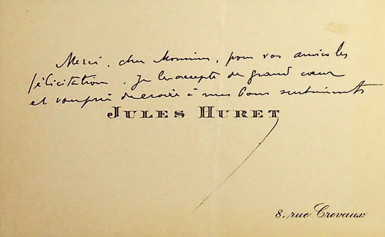 Jules Huret (1863-1915), écrivain, journaliste. C.A., sd, 1 ligne. « Avec mes plus vifs remerciements ». [473] Jules Huret (1863-1915), écrivain, journaliste. C.A., sd, 3 lignes. « Merci, cher Monsieur, pour vos amicales félicitations. Je les accepte de grand coeur et vous prie de croire à mes bons sentiments ». [473]