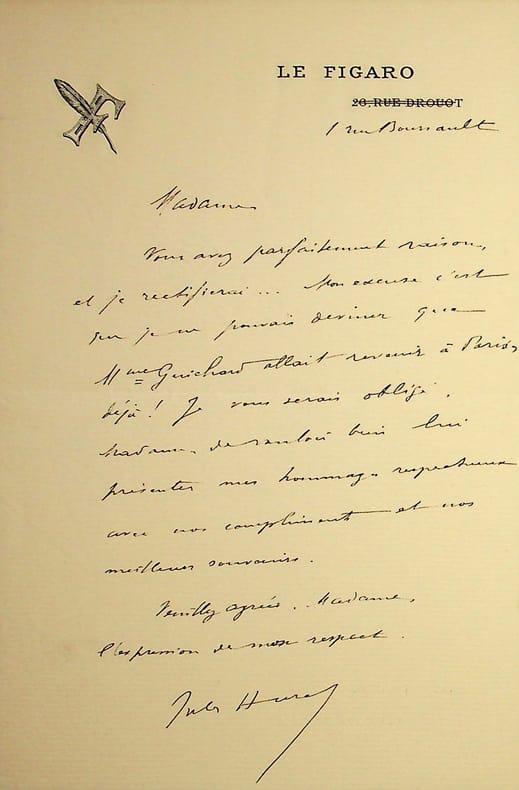 Jules Huret (1863-1915), écrivain, journaliste. L.A.S., Paris, sd, 1p in-8. Excuses à sa correspondantes et retour de « mme Guichard » en France (elle revient d'Argentine). [473]