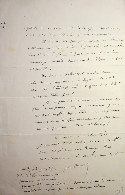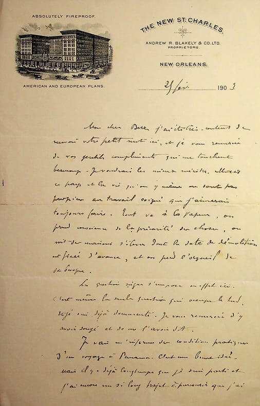 Jules Huret (1863-1915), écrivain, journaliste. L.A.S., New Orleans, 25 février 1903, 2p in-8. A l'écrivain Emile Berr (1855-1923). Très intéressante lettre : « Mon cher Berr, j'ai été très content de recevoir votre petit mot ici, et je vous remercie de vos gentils compliments qui me touchent beaucoup. Je voudrais les mieux mériter. Mais ce pays et la vie qu'on y mène ne sont pas propices au travail soigné que j'aimerais toujours faire. Tout va à la vapeur, on prend conscience de la précarité des choses, on voit des maisons s'élever dont la date de démolition est fixée d'avance, et on perd l'orgueil de la besogne. La question nègre s'impose en effet ici. C'est même la seule question qui occupe le sud. Et je suis déjà documenté. Je vous remercie d'y avoir songé et de me l'avoir dit. Je vais m'informer des conditions pratiques d'un voyage à Panama. C'est une bonne idée mais il y a déjà longtemps que je suis parti et j'ai encore un si long trajet à parcourir que j'ai peur de ne pas avoir le temps. Mais si ce n'est pas trop difficile, je me renseignerai. Il me semble que je n'ai pas vu beaucoup votre nom ces temps-ci Das le journal. Est-ce votre tour d'avoir la flemme ? Tout arrive ! Ou bien aurais-je missed des numéros du Figaro, ce qui est possible. We have a delightful weather here. The summer my dear. I began to need that after Pittsburgh where I have had 28° centigrade below zero ! Cet anglais ! C'est encore une raison de plus de ne pouvoir soigner mes articles. Je ne lis que de l'anglais depuis trois mois, et je vous assure que quelque fois, en écrivant, je cherche mes mots français ! Is-it not funny ? Au revoir, mon cher Berr, je suis content de voir qu'on ne m'oublie pas. Et je vous serre la main bien cordialement. A avril, sans doute. Jules Huret. P.S. ; Ici, à New York veux-je dire, les rédacteurs de journaux nos confrères gagnent 250.000 fr par an ! Bonjour à tous les camarades nonobstant ma pitié pour d'aussi maigres salaires ». [473]