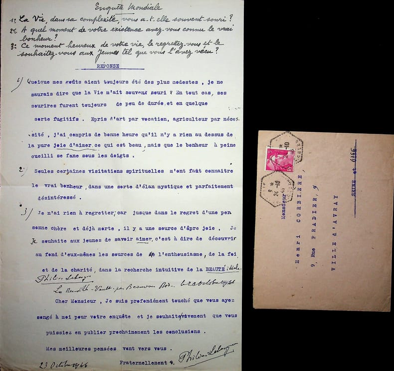Philéas Lebesgue (1869-1958), poète, écrivain. L.S. (avec corrections) + enveloppe, 23 octobre 1946, 1p in-4. Réponse à l'enquête d'Henri Corbière sur la vie. Signée à 2 reprises. Beau document. [473]