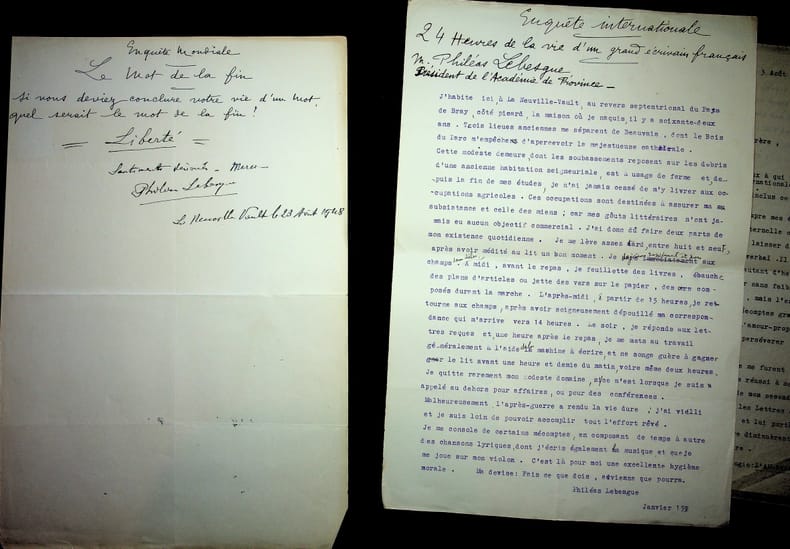 Philéas Lebesgue (1869-1958), poète, écrivain. P.A.S, 23 août 1948, 1/4p in-4. Réponse à l'enquête d'Henri Corbière « si vous deviez conclure votre vie d'un mot ». Le mot choisi par Lebesgue est Liberté. On joint une réponse à une autre enquête sur son métier (2p in-4, signée). On joint une réponse sur « 24 heures de la vie d'un grand écrivain » (tapuscrit corrigé, non signé). [473]