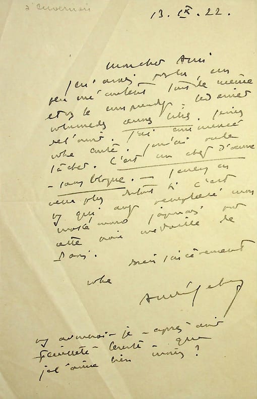 1 L.A.S. (135 x 210), 2 pp., à l'entête du 12, quai de Passy, adressée à Lucien Descaves. Très bon état.