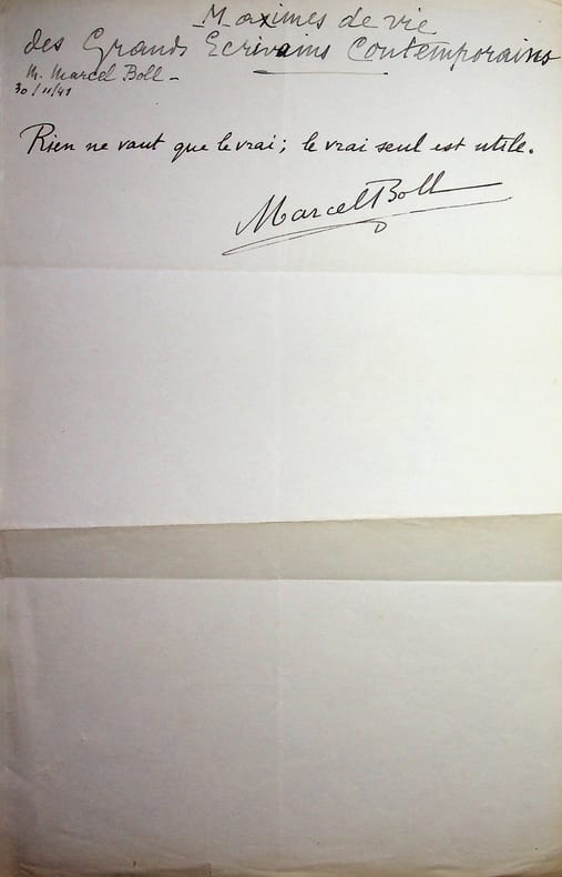 Marcel Boll (1886-1971), journaliste scientifique, professeur de chimie et d'électricité, fondateur de l'Union Rationaliste. P.A.S., 30 novembre 1941, 1/4p in-4. Réponse à l'enquête d'Henri Corbière sur les Maximes de la vie. « Rien ne vaut que le vrai ; le vrai seul est utile ». [473]