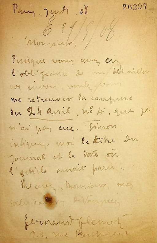 Fernand Fleuret (1883-1945), poète, écrivain. L.A.S., Paris, jeudi 08 [note : 29 mai 1908], 1p in-8. « Monsieur, Puisque vous avez eu l'obligeance de me détailler vos envois, voulez-vous me retrouver la coupure du 24 avril n°4 que je n'ai pas eue. Sinon, indiquez-moi le titre du journal et la date où l'article aurait paru. Recevez, monsieur, mes salutations distinguées. Fernand Fleuret ». [474]