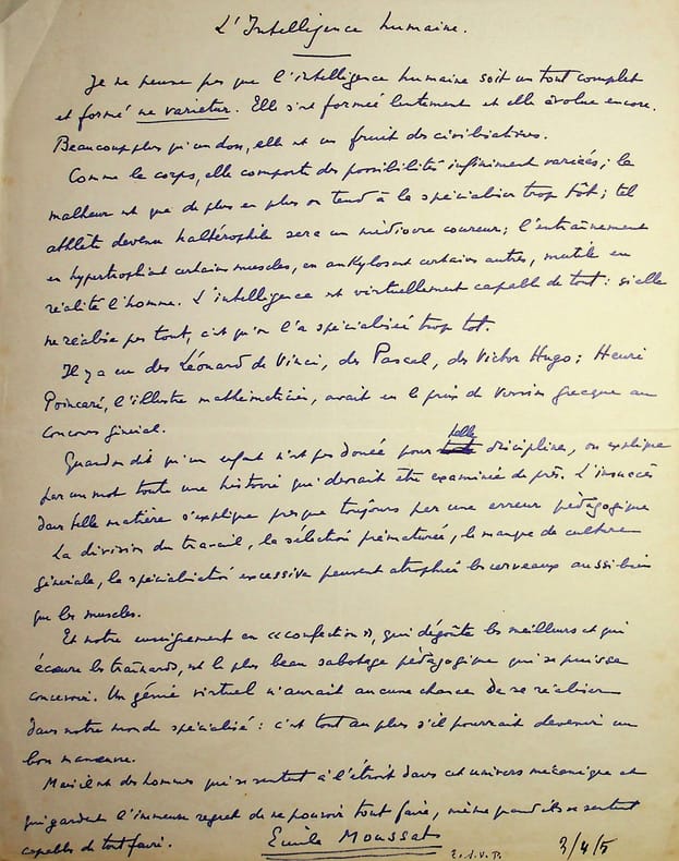 Emile Moussat (1885-1965), poète, écrivain, professeur, journaliste sportif. Manuscrit A.S., 3 avril 1959, 1p in-4. Long avis sur « L'Intelligence humaine ». [474]