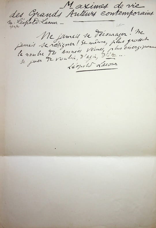 Léopold Lacour (1854-1939), écrivain, professeur, féministe. Manuscrit A.S., 4 décembre 1931, 1/2p in-4. Réponse à l'enquête « Maximes de vie des Grands Auteurs contemporains ». Lacour a répondu : « Ne jamais se décourager ! Ne jamais se résigner ! Et même, plus grossit le nombre des années vécues, plus énergiquement se jurer de vouloir, d'agir, d'être. Léopold Lacour ». [474]