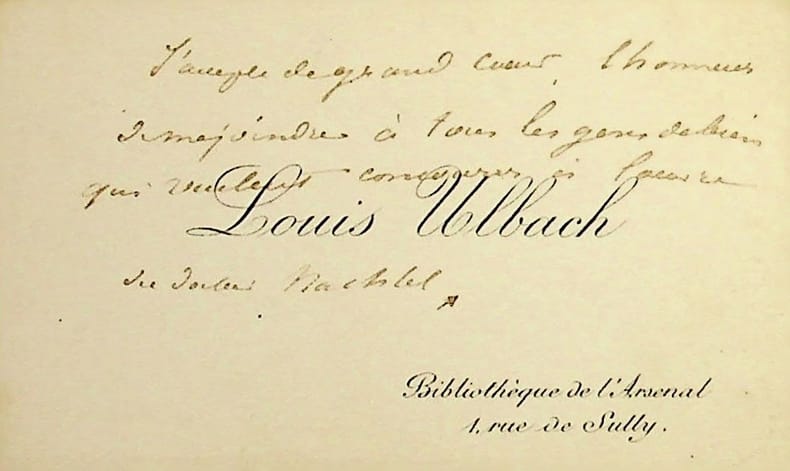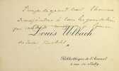 Louis Ulbach (1822-1889), écrivain, journaliste. C.A., sd, 4 lignes. Au docteur Henri Nachtel, à l'origine des ambulances publiques. « J'accepte de grand coeur l'honneur de me joindre à tous les gens de bien qui veulent concourir à l'oeuvre du docteur Nachtel ». [474]