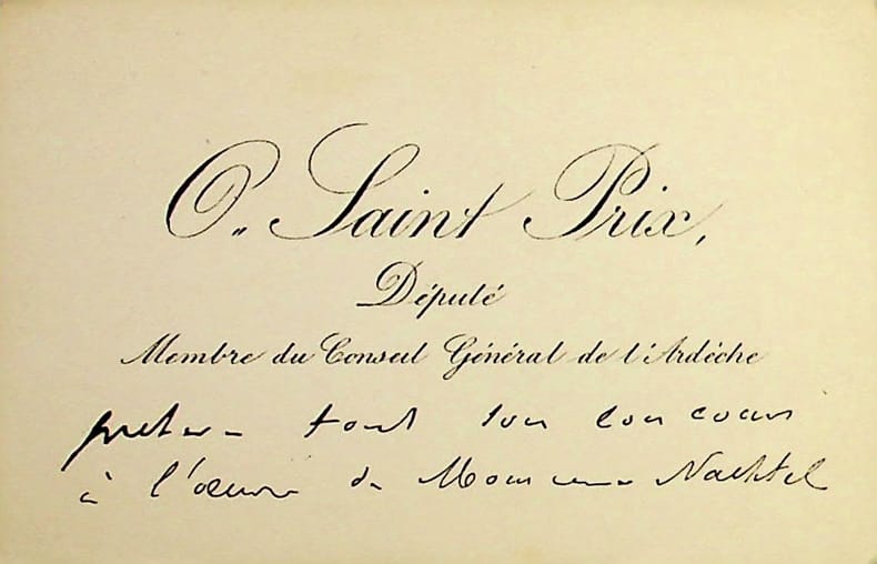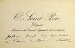 Oscar Soubeyran de Saint-Prix (1829-1904), homme politique, sénateur. C.A., sd, 2 lignes. Au docteur Henri Nachtel, à l'origine des ambulances publiques. O Saint Prix « prêtera tout son concours à l'oeuvre de Monsieur Nachtel ». [474]