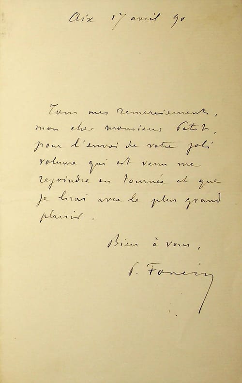 Pierre Foncin (1841-1916), historien, géographe, professeur. L.A.S., Aix [les Bains?], 17 avril 1890, 1p in-8. A l'historien et sociologue Edouard Petit (1858-1917). Remerciements pour l'envoi de son livre alors qu'il est en « tournée ». [475]